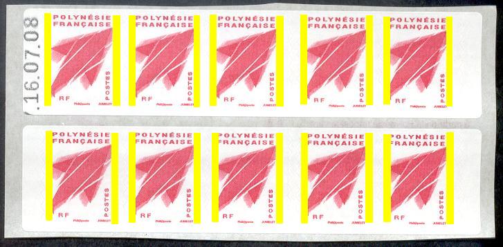 Les timbres imprimés pour les T.O.M. n'ont pas de bandes phosphorescentes à l'exception du carnet de la Polynésie Française composé de 10 timbres au tarif LETTRE 20g à destination de la France Métropolitaine et des D.O.M./T.O.M.