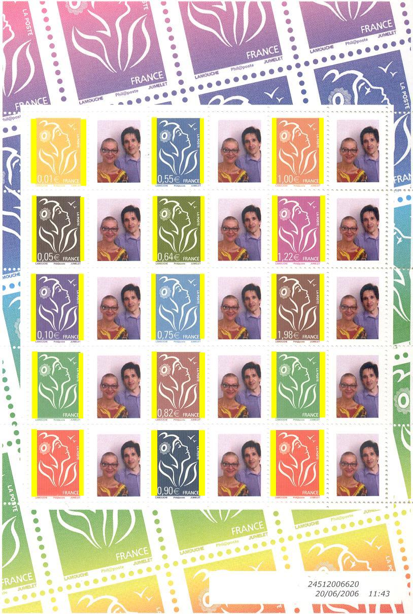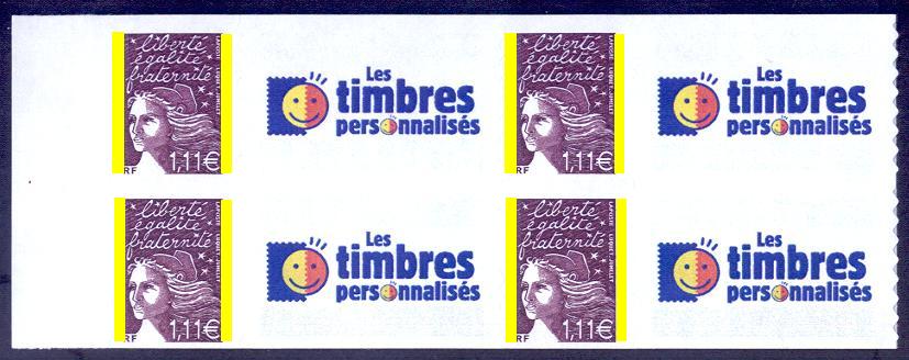 Le premier timbre avec une personnalisation a été proposé à la vente pour la première fois le 09.11.00, lors du 54e Salon Philatélique dAutomne à Paris, en bloc-feuillet de 10 timbres.