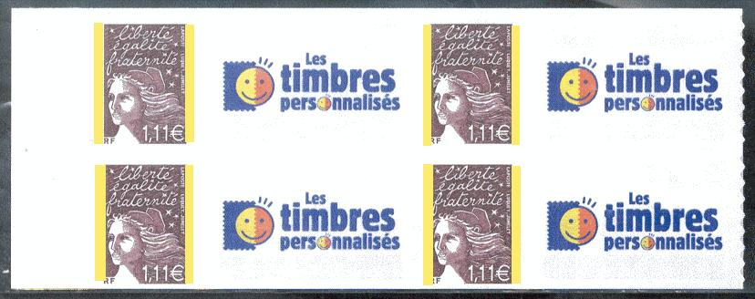 - TVP rouge, 0.82€ lilas-brun et 1.22€ lilas « Marianne des Français »Les timbres personnalisés en feuille sont destinés aux entreprises. L'impression en Offset est possible pour les grandes commandes en nombre pour augmenter la qualité et baisser les coûts de production.