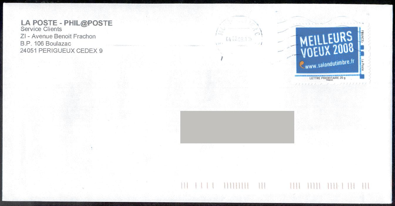 Ce timbre personnalisé a été utilisé pour inviter les philatélistes réservataires au Salon du Timbre et l'Ecrit 2008 ainsi que pour adresser les Voeux 2008 de Phil@poste.