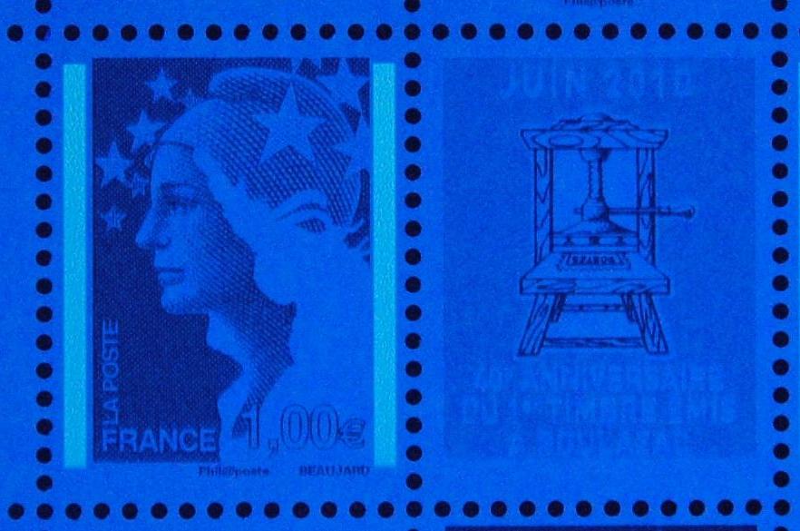 Les timbres avec des bandes phosphorescentes, uniquement les Marianne avec une valeur faciale égale à 1.00€, sont imprimés avec des bandes phosphorescentes Pho H.