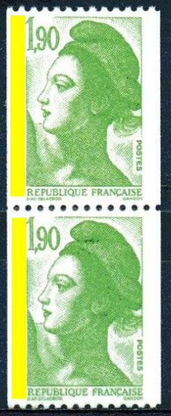 Il y aurait donc une roulette (de 500 ou 1000 timbres) sans bande phosphorescente pour 9 roulettes (de 500 ou 100 timbres) avec une bande phosphorescente à gauche.Cette théorie est confortée par la pièce ci-dessous (Roulette 2.20FF vert « Marianne du Bicentenaire » qui a la particularité davoir un petit filet phosphorescent (0.05 mm) à droite.