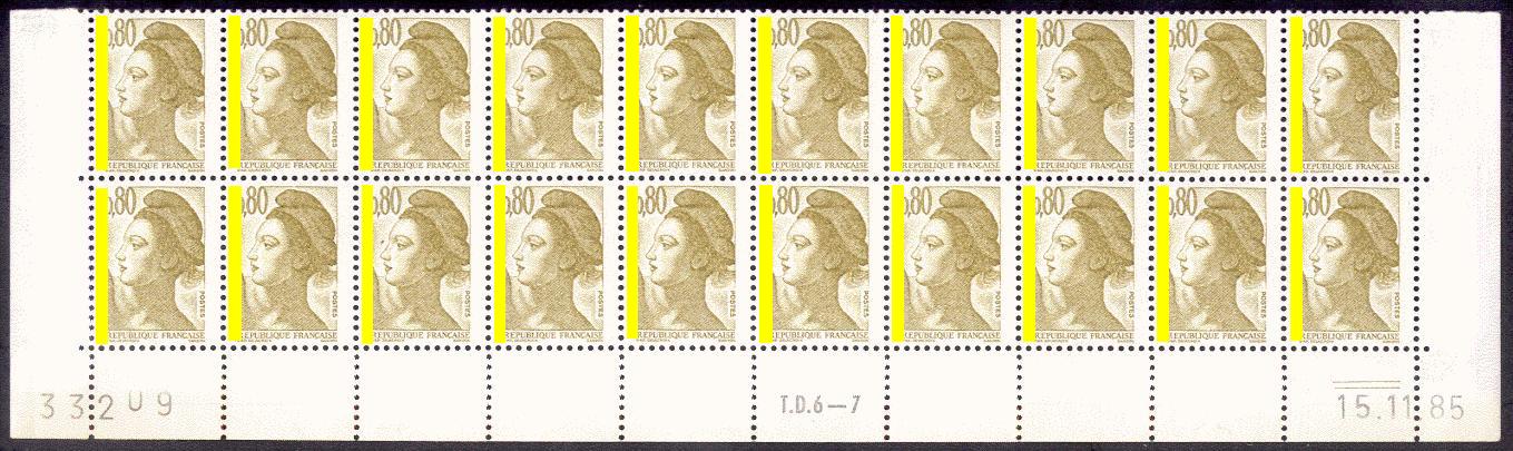 - sur les impressions avec deux bandes phosphorescentes, il nexiste pas de timbres sans bande phosphorescente liés à un décalage horizontal à l'exception d'un bloc « France à voir».