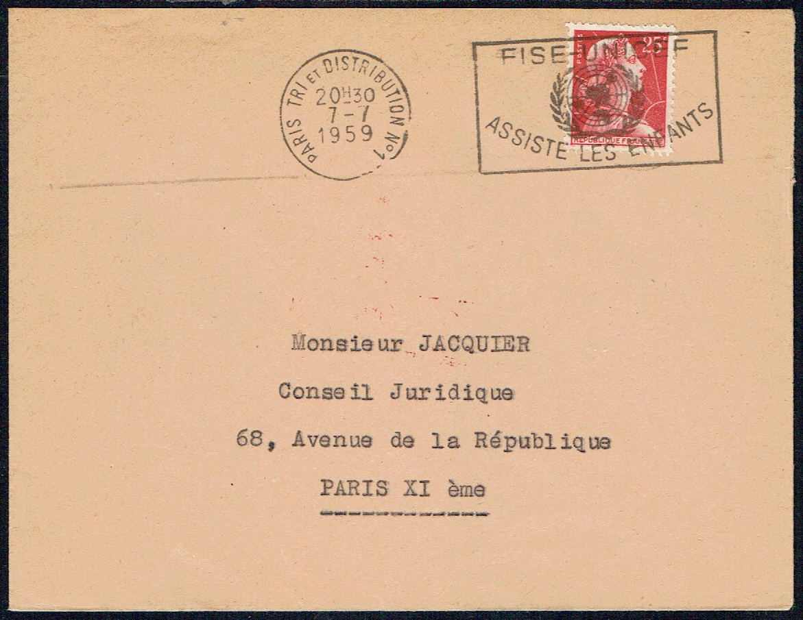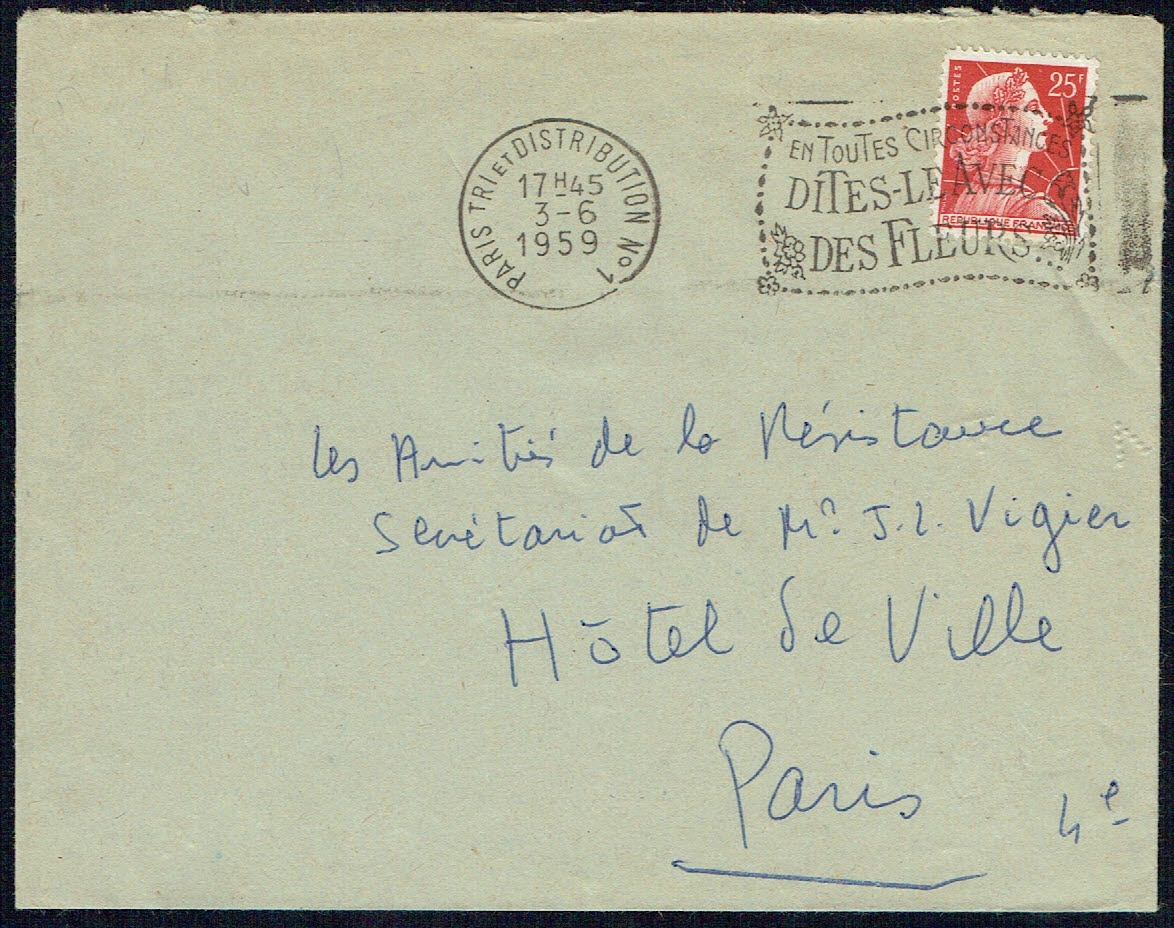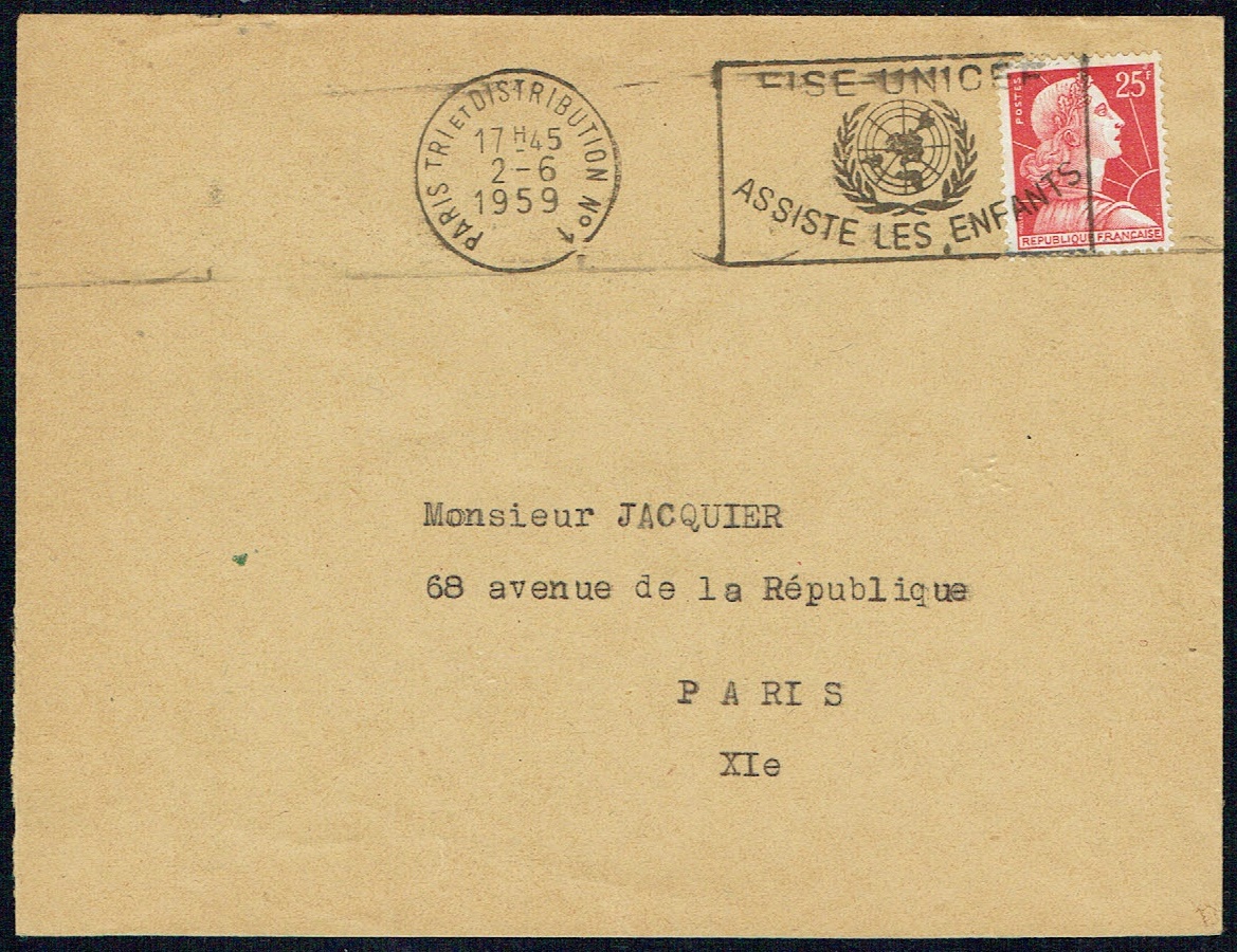 Lettre de Paris Tri distribution n°1 du 02.06.59 à destination de Paris