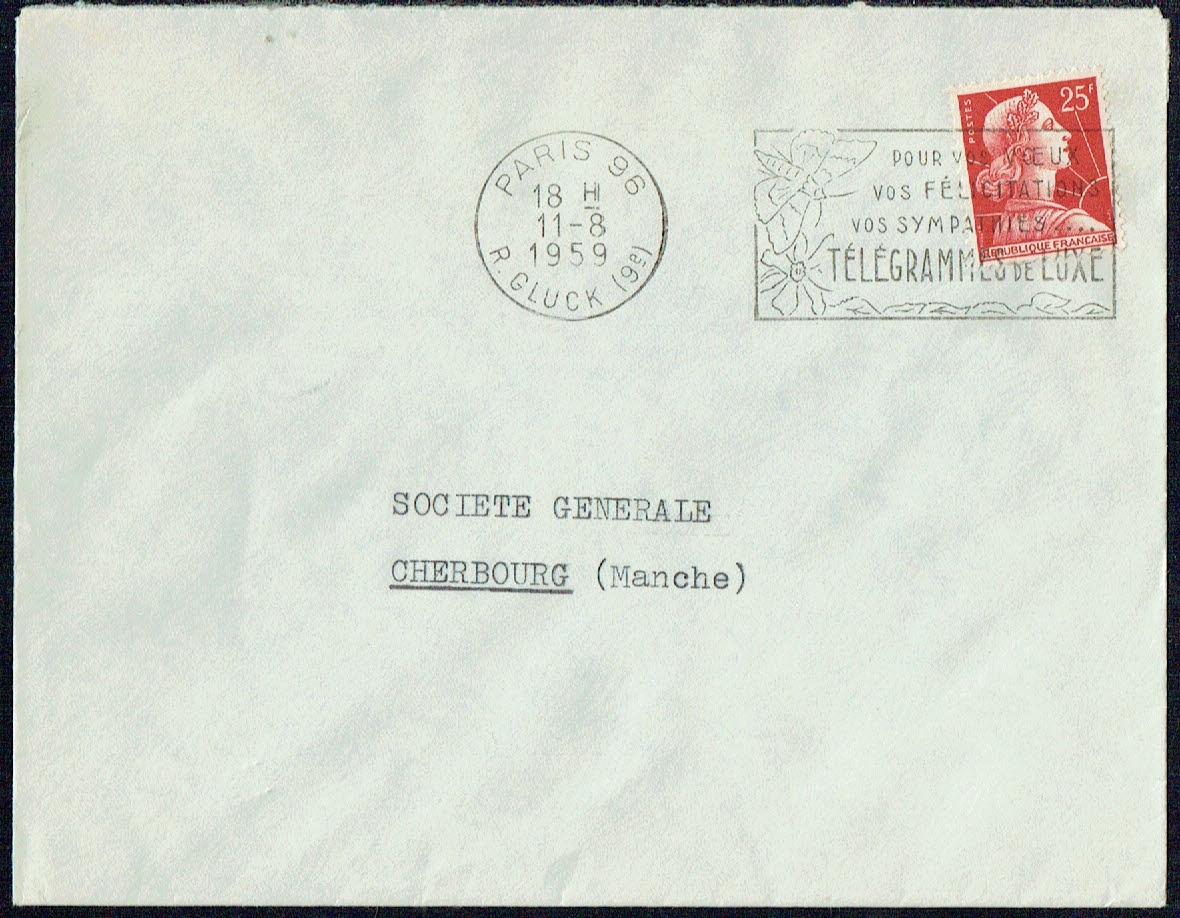 Lettre de Paris 96 du 11.08.59 à destination de Cherbourg (Manche)