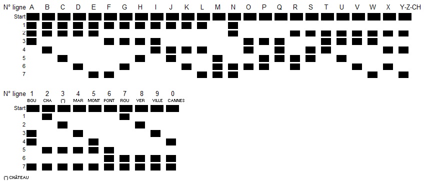 Les cinq emplacements du haut servent à la transcodification de la première lettre et les cinq autres à la transcodification de la seconde lettre.
