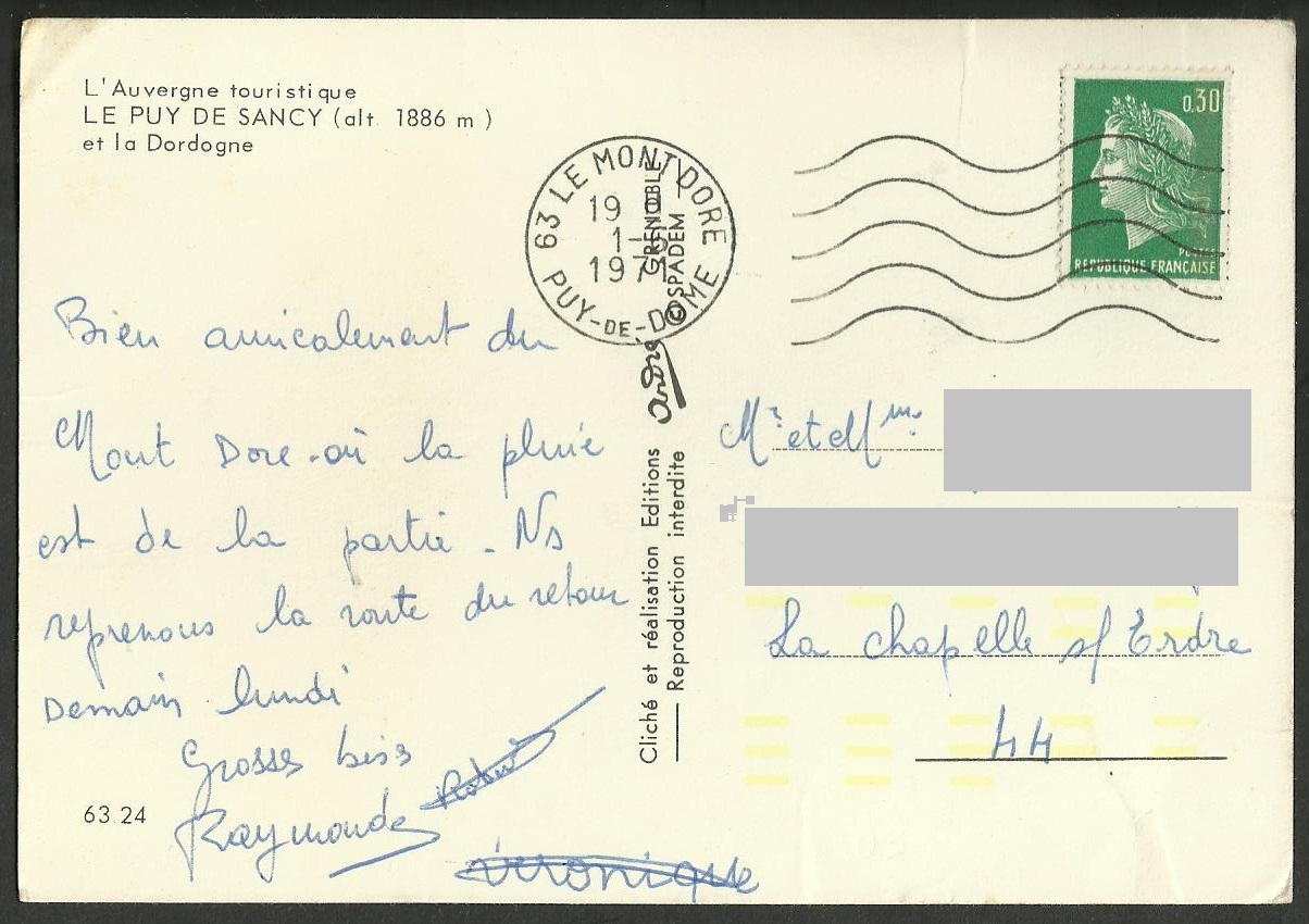 Lettre du Clermont-Ferrand (Puy-de- Dôme) du 23.12.70 à destination de Pontaumur (Puy-de-Dôme)