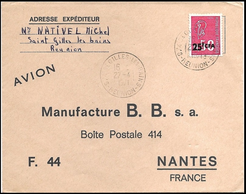 Le timbre 0,50 Marianne de Béquet surchargé 25F C.F.A. a été mis en vente anticipée à Saint-Benoît à la Réunion le 16 janvier 1971 et en vente générale le 18 janvier 1971. La surcharge en francs C.F.A. a été supprimée le 1er janvier 1975 et des timbres en francs français les ont remplacés.
