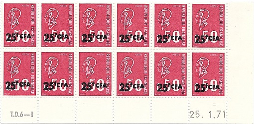- dated plate block of 12 stamps from the 25th printing with the cylinder AB overprinted 25F CFA