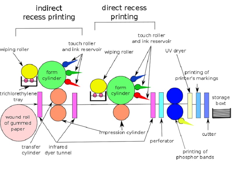 The first printing block is an indirect recess printing one. This first printing will have no relief (this block generally prints swaths of colour such as backgrounds). The form cylinder is engraved and the image is upright. After inking with cut touch rollers and wiping, the ink is deposited by pressure, with images back to front, on a transfer cylinder in soft plastic which, in turn, deposits ink by pressure in the face of the paper, as in offset. Printing is then dried in an infrared tunnel.
