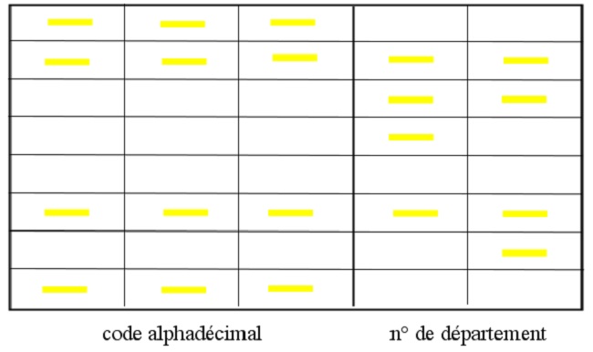 Ces marques sont situées au recto des enveloppes, en bas à droite. Elles sont constituées de cinq colonnes de quatre tirets jaunes fluorescents de 5 mm sur 1 mm pouvant occuper huit positions différentes. Les colonnes sont séparées par un intervalle de 6 mm et la marque totale s’inscrit dans un rectangle englobant de 53 mm par 25 mm, distant de 16 à 17 mm du bord droit de l’enveloppe et de 15 à 16 mm du bord inférieur de celle-ci. Ces marques sont imprimées à l’aide d’un ruban de soie à encre fluorescente. A partir de février 1968, on peut trouver deux chiffres en creux et à sec sous la 4ème colonne, qui donnent le numéro du poste d’indexation qui a codé l’enveloppe, comme on peut le voir sur l’image suivante :