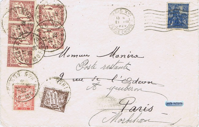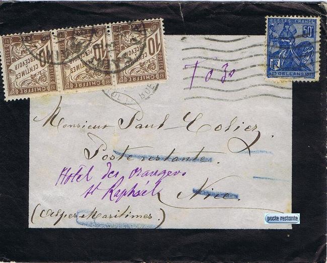 Cette lettre réexpédiée en poste restante n'a pas été taxée bien qu'elle porte un T indiquant qu'elle doit l'être. Le destinataire était probablement titulaire d'une carte d'abonnement. |