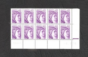 Voici un bloc de 10 timbres avec coin daté du « 04.09.79 » du « 1.60 FR violet , type Sabine » avec gomme hollandaise.