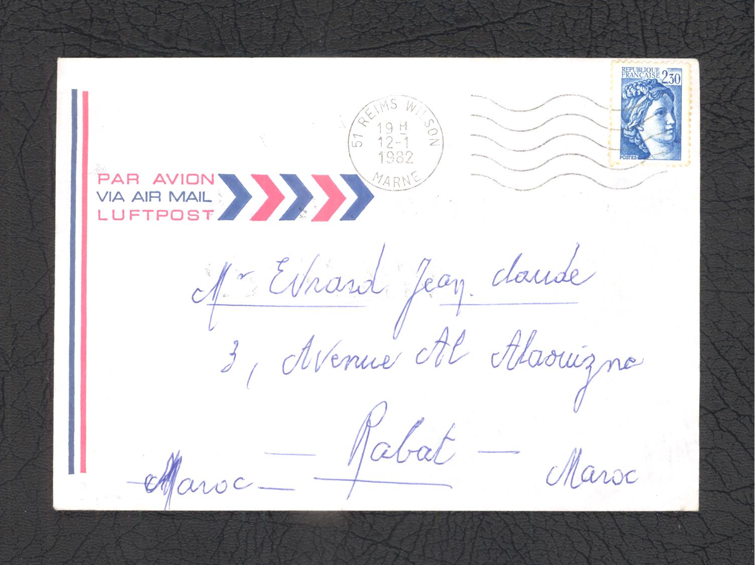 Pli affranchi à « 2.30fr bleu, Type SABINE » de Reims Wilson « Marne » ,le 12.01.1982 à destination de » Rabat au Maroc « .