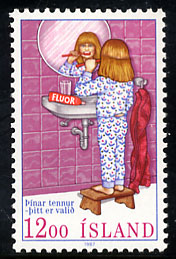 pour la protection dentaire Commentaires : Une fillette, debout sur un petit banc devant l’évier, se brosse les dents en se regardant dans le miroir de sa salle de bain. On y remarque aussi un tube de dentifrice, où il est écrit " Fluor " en larges lettres. On sait que le fluor apporte une bonne protection à la denture. Il semblerait, suivant certaines études, qu'au XIXe siècle, les Islandais avaient une excellente santé dentaire. Mais des études plus récentes, en 1970, démontrent une grande incidence de la carie dentaire, tout comme au Danemark, en Norvège ou en Suède. Mais si dans ces pays le taux de la carie est en diminution, cela n'est pas le cas en Islande malheureusement. Seulement 1.8% des enfants sont indemnes de carie. En 1974, le gouvernement sort une loi qui donne la gratuité des soins dentaires aux enfants âgés de 6 à 15 ans. Afin de donner encore plus d'importance à l'hygiène orale, la gouvernement a édité un timbre le 9 octobre 1987, montrant un jeune enfant se brossant les dents devant un miroir de sa salle de bain.