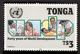 Le timbre consacré à la santé montre les 4 lettres de l'UNDP. Dans la 4e lettre P on aperçoit une dentiste soignant un patient. Cette série de 4 timbres a été émise également au N'iuafo'ou sous les n° 794 à 797.